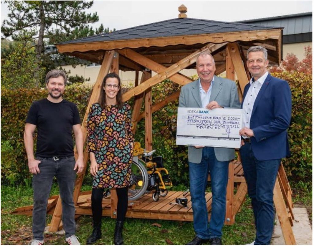 Thomas Hoch, Produktionsleiter bei Schwarzwaldhof, von dem der Vorschlag kam, überreichte den symbolischen Spendenscheck in Höhe von 2000 Euro an Julia Eberhardt und Sebastian Baumgartner, Schulleitung der Wutach-Schule. „Wir sind ein sonderpädagogisches Bildungs- und Beratungszentrum mit dem Förderschwerpunkt körperliche und motorische Entwicklung“, erklärte Julia Eberhardt und ergänzte: „Um die Wutach-Schule mit ihrem angegliederten Schulkindergarten bei der Förderung der Kinder unterstützen zu können, arbeiten die Schule und der Förderverein eng zusammen. Durch Spenden wie die der EDEKA-Mitarbeitenden können unter anderem verschiedene Anschaffungen wie beispielsweise jetzt ganz aktuell die Rollstuhlschaukel oder auch Ausflüge mitfinanziert werden.