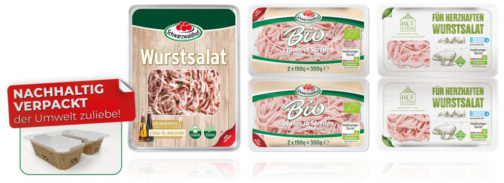 Auch die Lyoner in Streifen von Hofglück, unsere Marke für mehr Tierwohl und die BIO-Lyoner in Streifen von Schwarzwaldhof haben eine neue nachhaltige Verpackung.