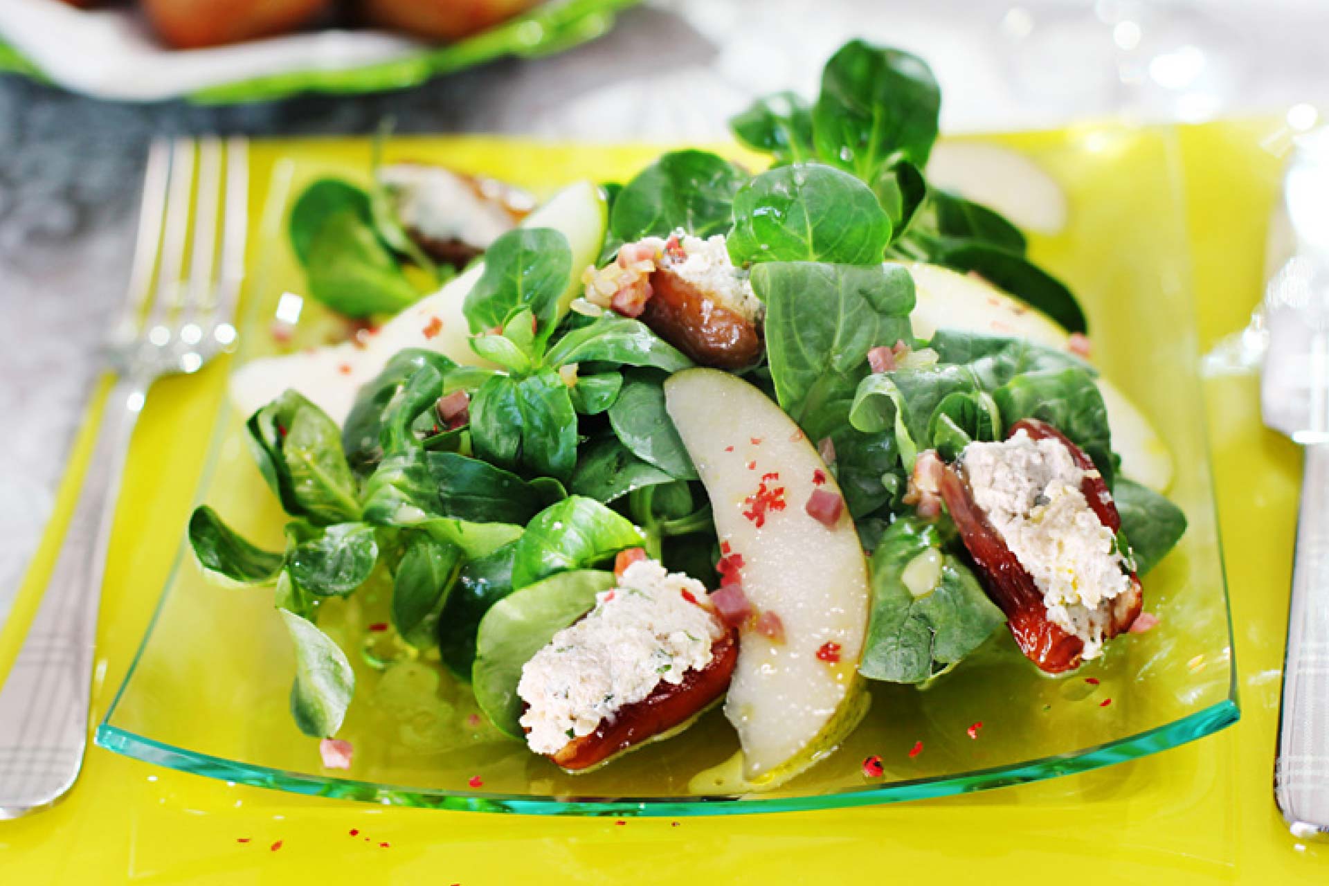 Für den Salat die Birne vierteln, entkernen und jedes Viertel in drei Scheiben schneiden. Mit dem Saft einer viertel Zitrone beträufeln. Die Schalotte fein würfeln und zusammen mit dem Speck ohne Öl bei milder Hitze in einer beschichteten Pfanne knusprig braten. Feldsalat auf drei Tellern verteilen. Gemüsebrühe mit Essig und Senf verrühren und anschließend das Öl zugeben. Auf dem Salat die Birnenscheiben anrichten und darauf das Dressing verteilen. Die noch warmen Speck- und Zwiebelgröstel darüberstreuen, Datteln darauf anrichten und die Pfefferbeeren darüberstreuen.